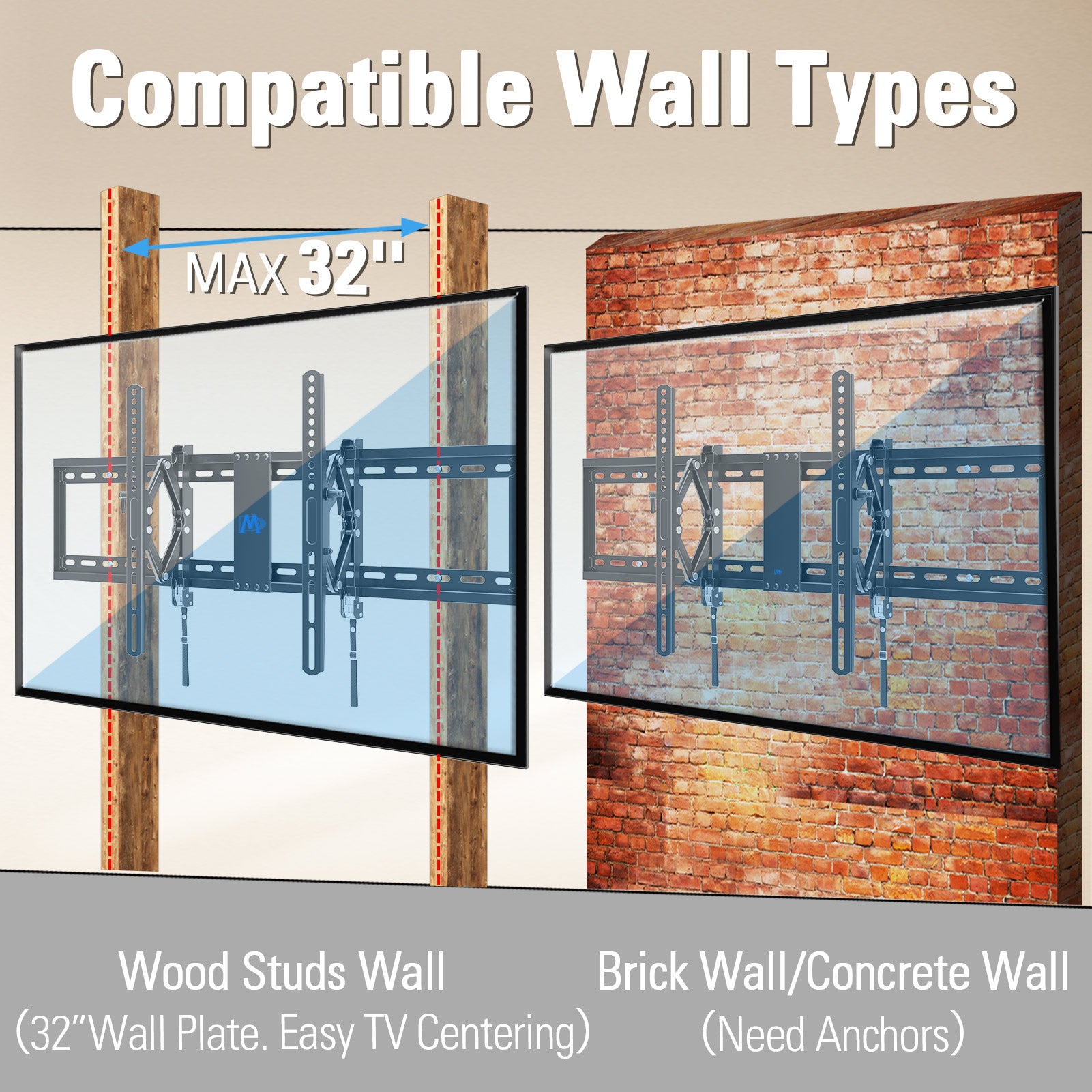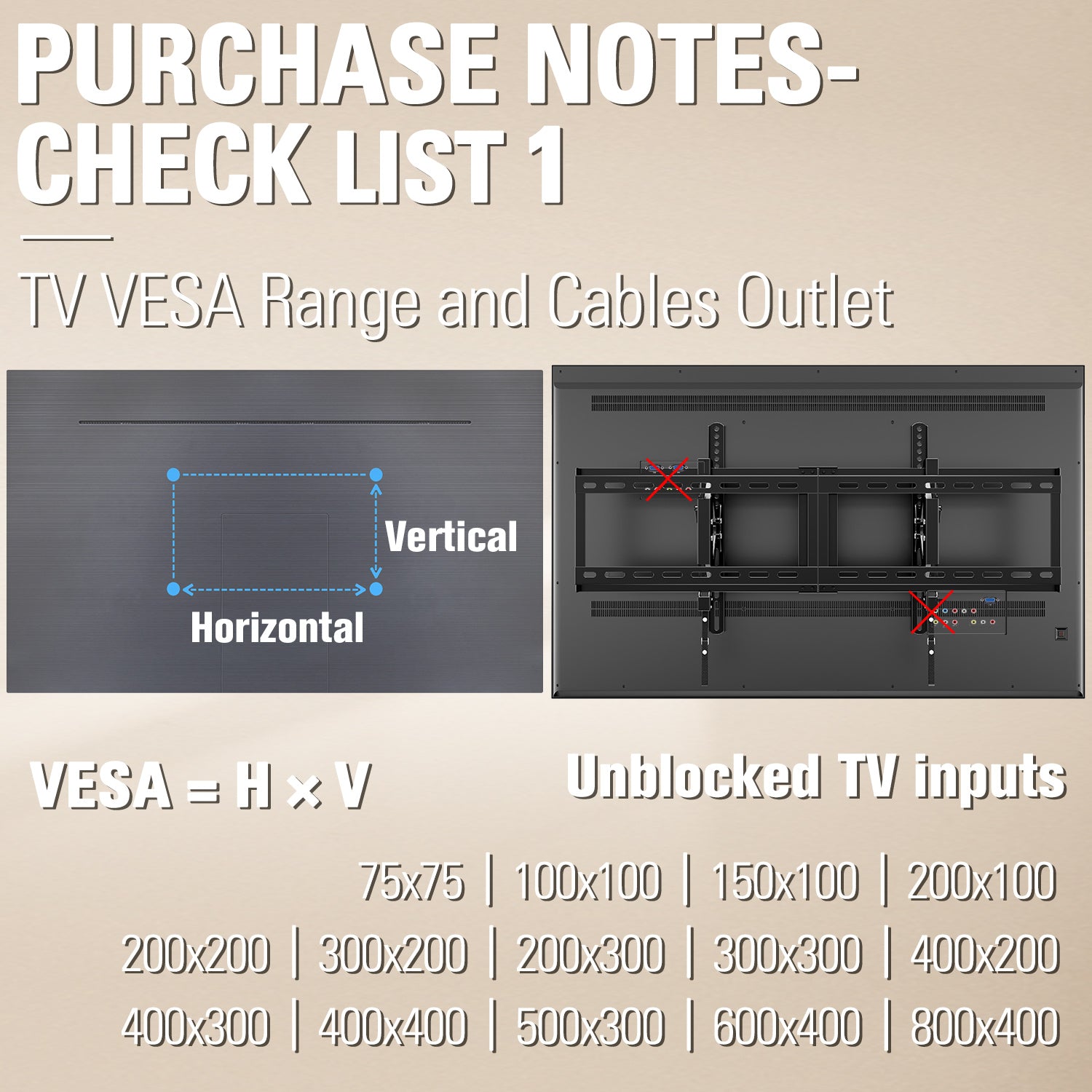 UNIVERSAL TV MOUNT: Advanced tilt TV wall mount fits most 42-90" TVs up to 120 lbs with MAX VESA of 800mm x 400mm and 16", 24", 32" wood studs spacing. Please check the TV VESA, TV weight, compatible wall types (wood studs spacing or concrete wall) and possible blocked input before purchasing.