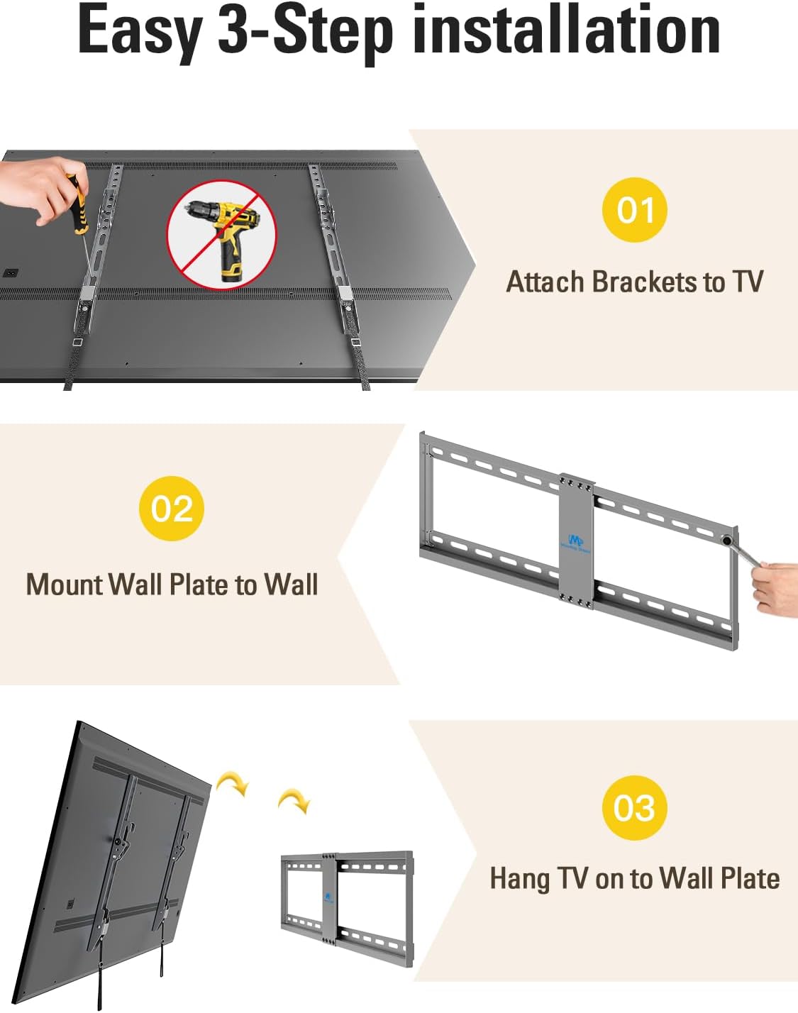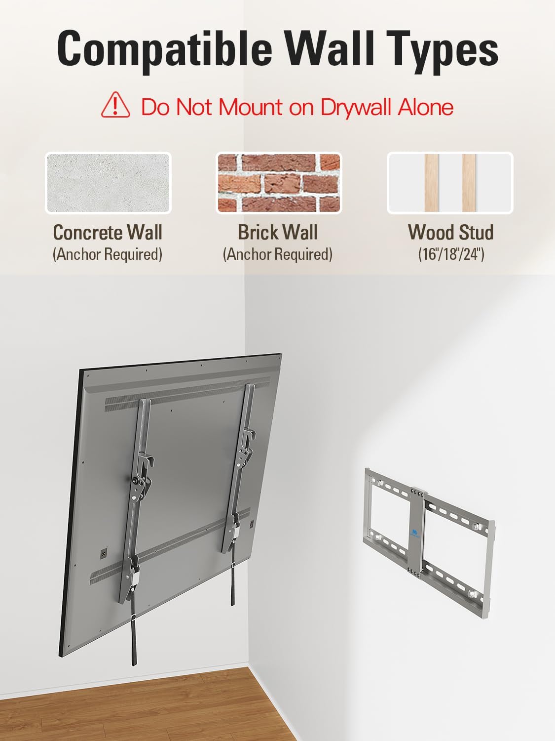 • [Quick and Easy Installation] Mounting Dream TV mount comes with decent instruction and necessary hardwares in pre-labeled bags, which helps to finish the installation within 30 minutes. Please note that this TV mount could not fit for drywall. Addtional anchors for concrete/ brick wall are available through Mounting Dream team.